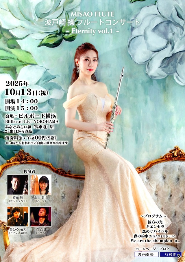 波戸崎操フルートコンサート2025 チケット at ビルボード横浜公演 10月13日(月・祝)14時開場/15時開演 お求め後にご連絡先へ指定席券をご郵送いたします。 特別なひとときを演出する波戸崎操フルートコンサート Billboard live 横浜 2025 チケット(指定席)。優雅なフルートの調べが響き渡る、このコンサートは音楽愛好者にとって見逃せないイベントです。波戸崎操氏が織りなす独自の音楽メッセージは、心を打つ感動を与え、聴く者を深く惹きつけます。素晴らしい音響環境の中、指定席での鑑賞が可能なこのチケットは、あなたの特別な思い出作りをサポートします。立地の良い横浜で、心地よい音楽と共に過ごすひとときを楽しんでいただけます。 ■ カラー/サイズ/バリエーション チケットは1枚単位での販売となっており、指定席となります。イベント日程と時間はチケット購入後にご確認いただけます。 ■ お手入れ/取り扱い注意事項 チケットの管理は大切に行ってください。紛失や破損にご注意ください。また、イベント当日はチケット提示が必要となりますので、必ずご持参ください。 ■ 発送・注文に関する情報や注意事項 ご注文後、ご郵送にてチケットをお送りします。チケット購入後のキャンセルや返金はお受けしておりませんので、ご了承ください。 ■ その他の情報や注意事項 このコンサートは人気のため、早めの購入を推奨いたします。予定通りの開催については、公式情報をご確認ください。 お問い合わせは、ショップのお問い合わせフォームからお願いいたします。また、イベントに関する詳細な情報もそちらでご確認いただけます。ぜひ、この機会に特別なコンサート体験を楽しんでください。